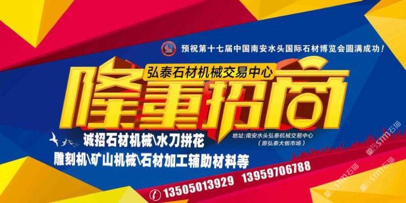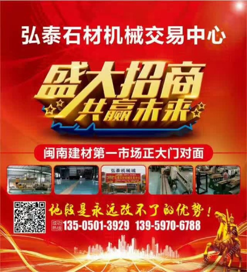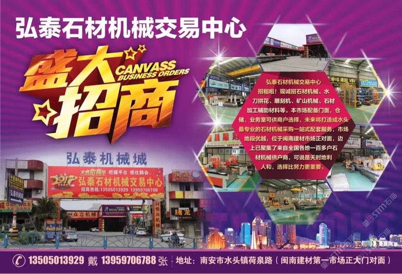 弘泰石材機(jī)械交易中心招租啦!現(xiàn)誠招石材機(jī)械、水刀拼花、雕刻機(jī)、礦山機(jī)械、石材加工輔助材料等。本市場配備門面,倉儲,業(yè)務(wù)室可供商戶選擇,未來將打造成水頭專業(yè)的石材機(jī)械采購一站式配套服務(wù),市場地段優(yōu)越,位于閩南建材市場正對面,邊上已聚集了來自全國各地一百多戶石材機(jī)械供戶商,可說是天時地利人和,選擇比努力更重要。
