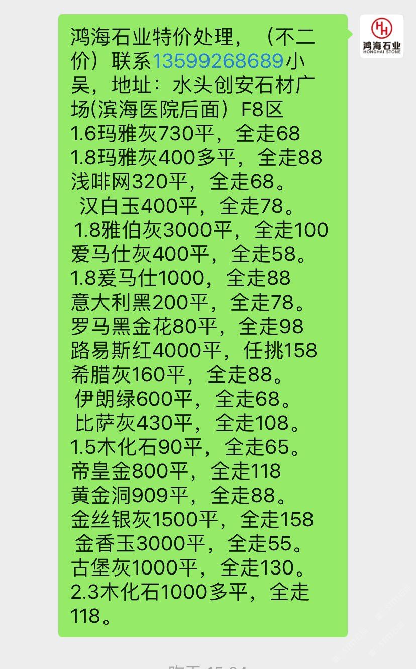 鴻海石業(yè)-現(xiàn)板5萬(wàn)平特價(jià)處理,(不二價(jià))聯(lián)系13599268689小吳,地址:水頭創(chuàng)安石材廣場(chǎng)(濱海醫(yī)院后面)F8區(qū) 1.8絲綢白3000平,150起 1.8金絲銀灰7500平,100起1.8夢(mèng)幻藍(lán)4500平,100起。1.8卡拉垃白一150元起。 1.8藍(lán)色星球1300平,150起水墨年華6000平全走78。 1.8午夜星河1300平,150起1.8多蘭戈(紅色)300平,柏斯高灰2000平,全走88 新瑪雅灰3500平,全走88 1.5瑪雅灰200多平,全走68 星塵灰400平,全走88。 愛(ài)馬仕灰7500平,全走78 羅馬黑金花60平,全走88 黃金洞909平,全走88。 金香玉300平,全走50。 古堡灰1000平,全走99。 云?;?00多平全走128。2.3木化石100平,全走128。