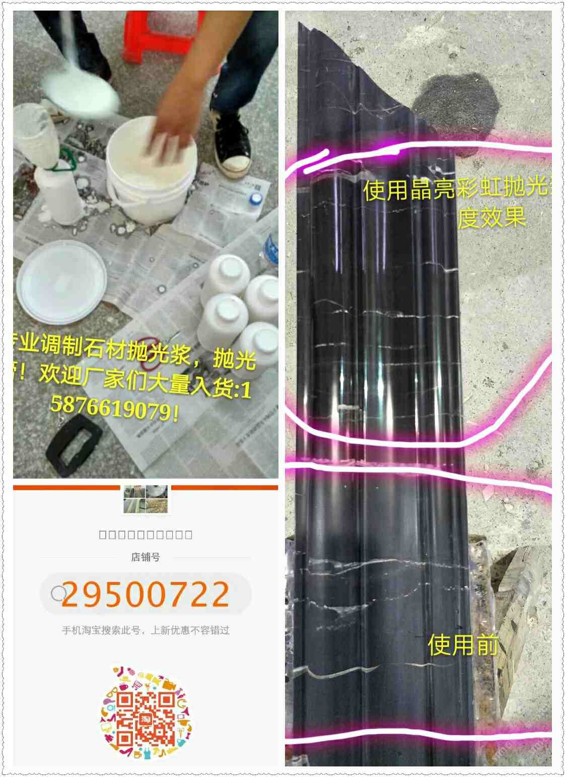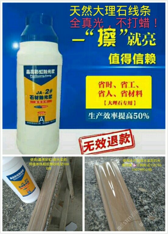(晶亮彩虹拋光漿)為配方調(diào)制。從2016年5月份開始靠著技術員親自逐間上門到云浮多家石材工藝廠施展產(chǎn)品使用技術和試驗產(chǎn)品光度效果取得了各家老板和工藝師們的稱贊和認可,通過短短一年的時間品牌:晶亮彩虹拋光漿全國省地已約2000家石材廠正在使用,市場反應效果顯注,現(xiàn)面向全國誠招代理商??头峋€:15876619079