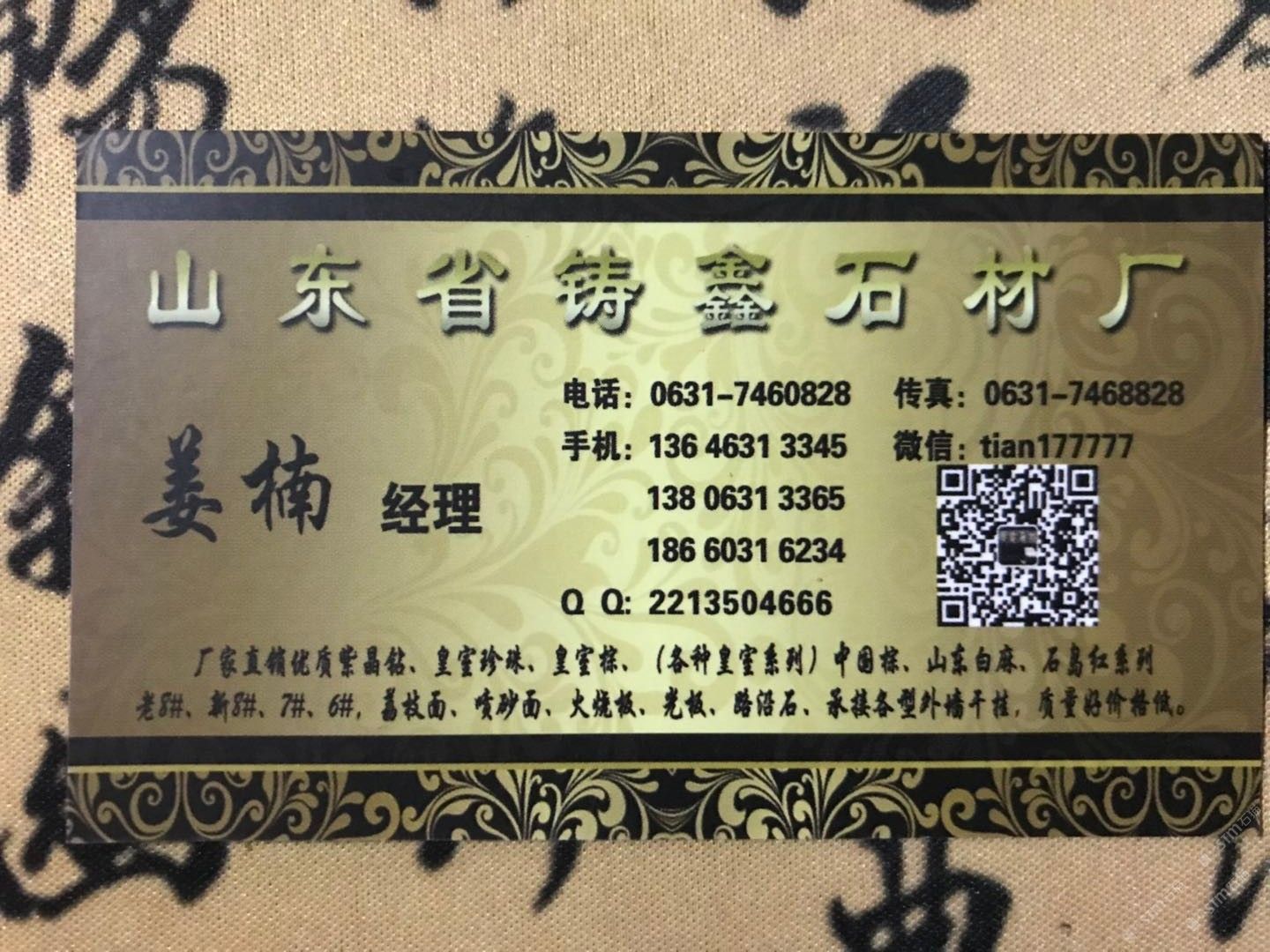 中國(guó)山東威海您好我是山東省榮成市石島紅產(chǎn)地鑄鑫石材有限公司公司成立于1992年主要經(jīng)營(yíng):石島紅老8#新8#7#6#皇室系列紫晶鉆白麻榮成灰等優(yōu)質(zhì)產(chǎn)品,A級(jí)荒料火燒板光板荔枝面復(fù)古