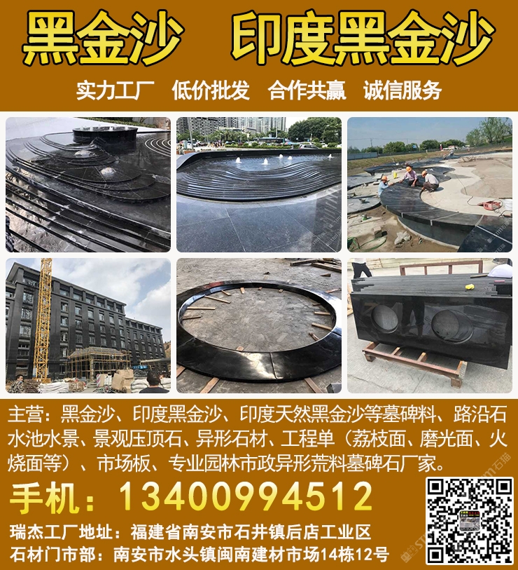 瑞杰黑金沙林總13400994512專業(yè)印度黑金沙供應(yīng)商,實(shí)力石材工廠主要加工:黑金沙、黑金砂、印度黑金沙、印度天然黑金沙、印度黑色石材、印度黑石、黑金沙石材、黑金沙花崗巖、新礦黑金砂、國產(chǎn)黑金沙、新黑金沙石材等墓碑料、路沿石、水池水景、景觀壓頂石、異形石材、工程單(荔枝面、磨光面、火燒面等)、市場板、專業(yè)園林市政異形荒料墓碑石廠家,實(shí)力工廠、低價(jià)批發(fā)、合作共贏、誠信服務(wù). 工廠地址:福建省南安市石井鎮(zhèn)后店工業(yè)區(qū),門市部:南安市水頭鎮(zhèn)閩南建材市場