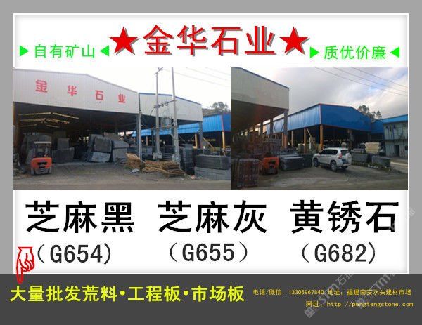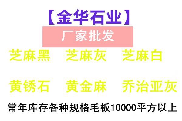 【金華石業(yè)】專門立足于本地豐富的自然資源,擁有成套先進的石材設備,專業(yè)石材加工技術人員,掌握先進的石材加工技術,制定了一整套嚴格的質量控制體系,品質管理嚴格,專業(yè)生產本地石材:G654(芝麻黑),G655(芝麻灰),G682(黃銹石),G603(芝麻白),喬治亞灰,蝦紅、虎皮黃、毛光板,火燒板,踏步板,盲道板,機刨板,荔枝面,路沿石,蘑菇石,花壇石,花崗巖自然面,建筑用塊石,大型門牌石,墓碑石和橋柱橋欄,圓柱,等各種板材和弧形異型加工。