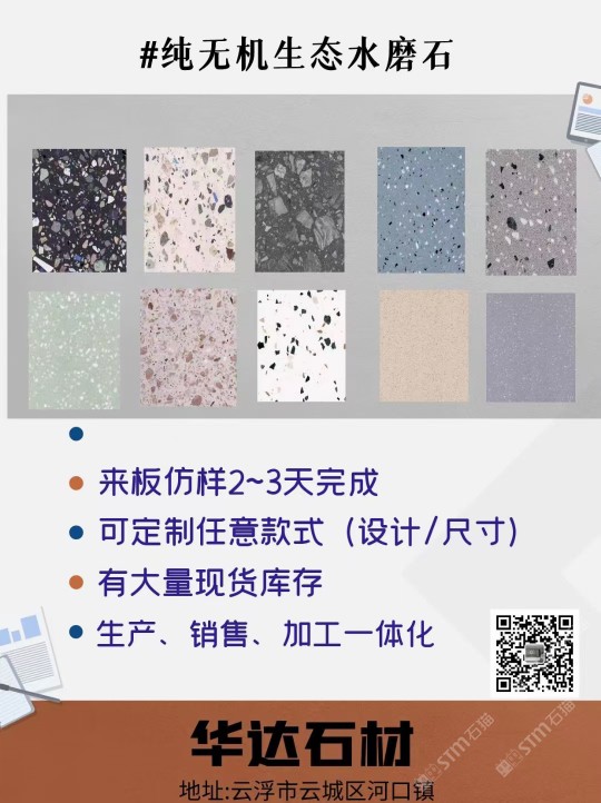 云浮市華達聚賢新型石材有限公司是一家以研發(fā)制造、加工、銷售新型人造石、天然石及其制品的企業(yè)。公司位于云浮市云安區(qū)石城鎮(zhèn)上洞村,占地面積30000平方米,年可生產(chǎn)人造無機石板材、自流平仿石材產(chǎn)品120萬平方。公司擁有原材料生產(chǎn)配套基地,保證日常生產(chǎn)所需的石料、石粉,有成品加工生產(chǎn)車間,有直營門店銷售,能為客戶提供從原材料選料、打樣定制、生產(chǎn)加工、工程配套等服務(wù)。華達聚賢新型石材無機水磨石、仿石材產(chǎn)品,屬于循環(huán)利用環(huán)保產(chǎn)品,所有原材料都是無機類選材,產(chǎn)品美觀實用,耐污耐磨,防火性能好,無異味,色彩斑斕,搭配元素多樣,深受國內(nèi)外設(shè)計師喜愛,適用于家具、商場、學(xué)校、酒店、地鐵站、政府機關(guān)、企業(yè)機構(gòu)等大型公共設(shè)施室內(nèi)外鑲貼,屬新型環(huán)保建材。公司通過GB/T19001-2016idtISO9001:2015質(zhì)量管理體系認證和GB/T24001-2016idtISO14001:2015環(huán)境管理體系認證。