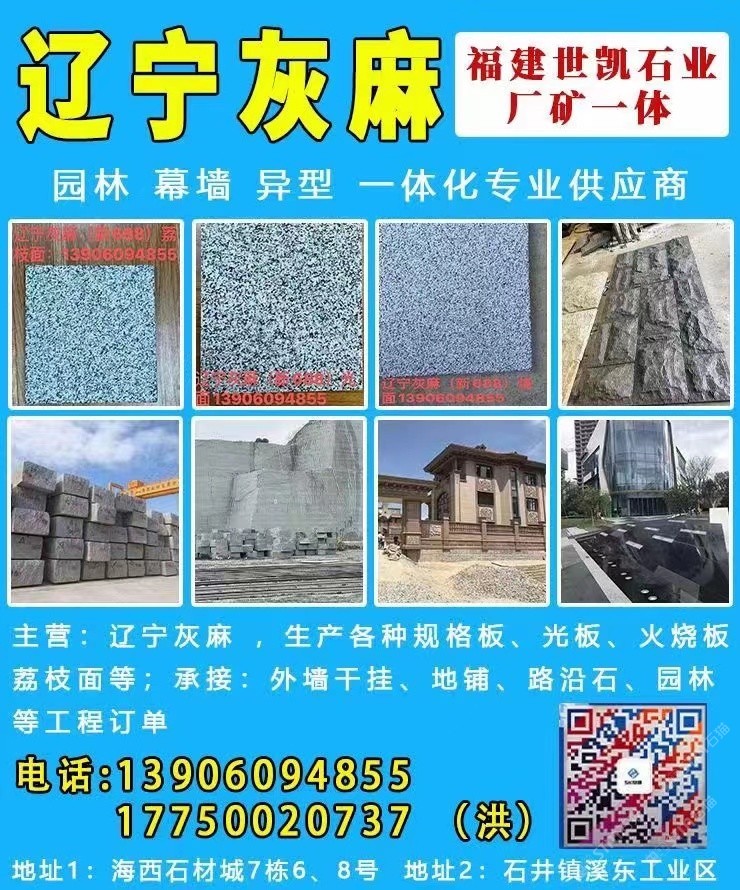 主營(yíng)石種:遼寧灰麻(新688) 、 芝麻黑(新G654) ,長(zhǎng)期儲(chǔ)存5000~10000立方荒料,滿(mǎn)足各大石材工程需求。從荒料開(kāi)采到成品呈現(xiàn),產(chǎn)品涉及園林、幕墻、異型等各類(lèi)工程訂單,廠礦一體,公司下設(shè)荒料堆場(chǎng)部,市場(chǎng)營(yíng)銷(xiāo)部,工廠配備專(zhuān)業(yè)生產(chǎn)先進(jìn)機(jī)械設(shè)備。25年來(lái)專(zhuān)注于各種天然石材加工、成品、銷(xiāo)售?,F(xiàn)已成為專(zhuān)業(yè)國(guó)內(nèi)外石材供應(yīng)商,本著“誠(chéng)信為本,合作共贏”經(jīng)營(yíng)理念,為廣大客戶(hù)提供生產(chǎn)配套以及大型施工安裝一條龍服務(wù)!