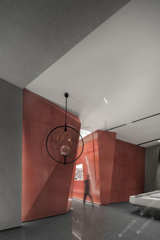 發(fā)布信息: 紅色淺紋洞石運(yùn)用室內(nèi)墻面,異型拼接無(wú)縫處理