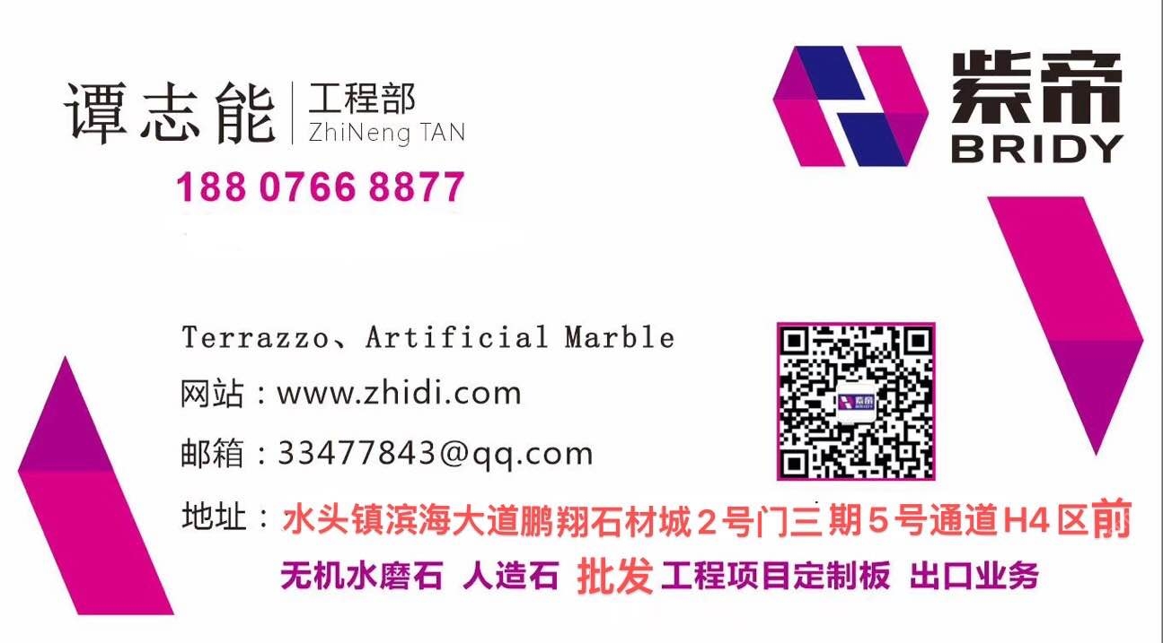 廣東紫帝石業(yè)有限公司 聯(lián)系人:譚經(jīng)理    180****0113 查看 手機(jī)號(hào)碼:無 主營(yíng)范圍: 大板批發(fā)、人造石加工、石材交易市場(chǎng)、 企業(yè)地址:廣東云浮云城區(qū)北一路紫帝人造石