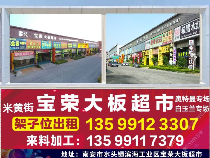 寶榮大板超市 聯(lián)系人:王    134****5689 查看 135****3307 查看 主營(yíng)范圍: 石材交易市場(chǎng)、大板批發(fā)、大理石加工、 企業(yè)地址:福建泉州南安市寶榮大板市場(chǎng)