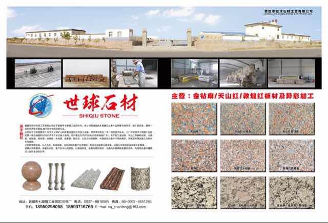 敦煌市世球工藝有限公司 聯(lián)系人:陳先生    187****9001 查看 189****8055 查看 主營(yíng)范圍: 礦山、荒料、異型加工、花崗巖加工、石材工藝品、 企業(yè)地址:甘肅酒泉敦煌七里鎮(zhèn)工業(yè)園區(qū)25號(hào)廠