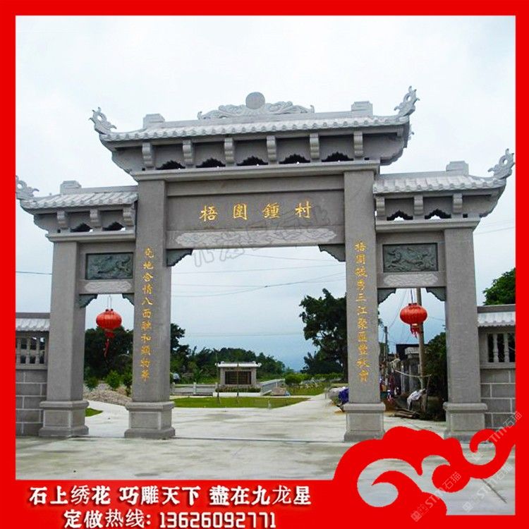發(fā)布信息: 石牌坊制做廠家 鄉(xiāng)村牌坊大門效果圖大全賞析——九龍星石業(yè)。 鄉(xiāng)村牌坊大門效果圖具有相當(dāng)高的實用性的,從建筑的美觀上石牌坊是一個建筑的 代言,從文化上石牌坊是一個區(qū)域或一個地域或一個民族的文化修養(yǎng)代言,在使用性 上從小的來說石牌坊可以做一個院落的大門,可以是一個街和它文化的開端。 石牌坊制做廠家在制作上其用料的選擇是非常講究的,在雕刻制作時也是要 求的比較的精致。而且美麗鄉(xiāng)村入口牌坊上都混雕刻有圖案和文字有著深厚的文化以 及當(dāng)?shù)氐拿耧L(fēng)民俗。在村指引牌坊圖片的制作過程中,每一座石牌坊都會采用陰刻、 線刻、浮雕、鏤雕、雙面雕等多種不同的雕刻手法,使新農(nóng)村石牌坊在雕刻制作上的 圖案更加的生動。 鄉(xiāng)村牌坊大門在主題外觀和內(nèi)容雕刻上本身就是一種藝術(shù)的詮釋。比如在門樓 四個柱腳上制作瑞獸例如:麒麟、貔貅、瑞獅、瑞象、抱鼓等傳統(tǒng)的祥瑞圓雕雕刻。 也可以和諧的添加一些西方建筑經(jīng)典,在建筑藝術(shù)上它是不分界限的,我們在美麗鄉(xiāng) 村入口牌坊外觀的設(shè)計制作上,可以有一些和諧的改造也是體現(xiàn)提倡建造者的文化修 養(yǎng)的表現(xiàn)。