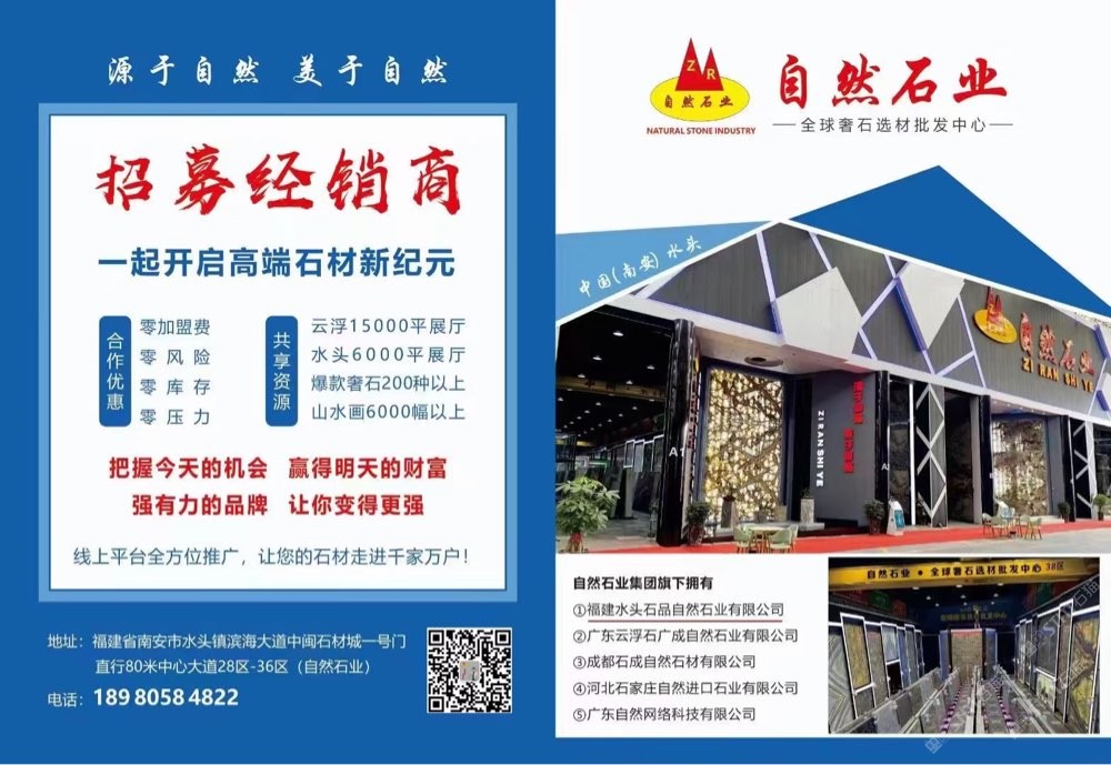 發(fā)布信息: 自然石業(yè)全球奢石批發(fā)中心,招募經(jīng)銷商,無需加盟費,一手貨源,專業(yè)背景墻供應(yīng)廠家。歡迎選購 ??19305059488(微信同號) 主營:潘多拉,新款潘多拉,藍絲綢,紅絲綢,絲綢之路,魅力人生,蒂芙尼,卡拉白,魚肚白,魚肚灰,盛世紅顏,紅寶石,石榴紅寶,桃李春風(fēng),金枝玉葉。金玉滿堂,金孔雀,孔雀開屏,火樹銀花,潘多拉,維也納,亞馬遜綠,綠翡翠,加雅綠,白色羅馬,藍色羅馬,羅馬印象,海納百川,春山畫境,冰河世紀(jì),波光靈動,金戈壁玉,天澤玉石,鉑金鉆,翰墨白金,景泰藍,皇家藍,白銀狐,雪山銀狐,雪山蘭,雪山藍,雪山白,山水畫,煙影流香,藍水晶,紫水晶,加爾達之晶,龍文綠,竹節(jié)綠,綠斑竹,紫氣東來,千里馬,藍色精靈,壁山芳華,格蘭云天,香格里拉,夢幻藍寶,海洋之星,綠野仙蹤,藍翡翠,自然白,羅馬灰,白底潘多拉等產(chǎn)品!有單你來談,價格好商量! 中閩石材城28區(qū)-36區(qū)(一號門直走一百米左手邊)