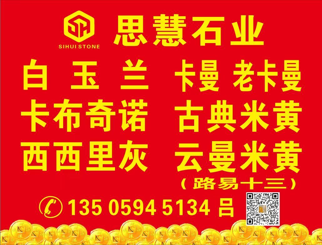 思慧石業(yè) 聯(lián)系人:呂    135****5134 查看 135****5134 查看 主營(yíng)范圍: 大板批發(fā)、荒料、大理石加工、礦山、其他、石材外貿(mào)、水刀拼花、異型加工、花崗巖加工、石材雕刻、 企業(yè)地址:福建泉州東升石材城4號(hào)門(mén)通道走到底左手邊D26