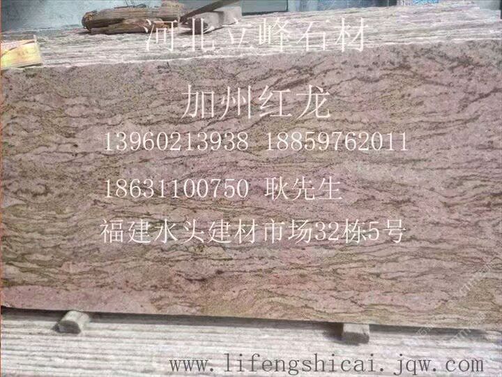 發(fā)布信息: 加州紅龍全球供應(yīng)商,雪浪石,小米黃,黑白山水石。電話13960213938微信同號(hào)。地址,水頭建材市場(chǎng)32棟15號(hào)。海西建材市場(chǎng)11棟10號(hào)。水頭工廠地址,建材市場(chǎng)對(duì)過,銘亮石材廠。荒料,海西荒料市場(chǎng)2號(hào)倉1號(hào)吊下邊。廠址河北省石家莊市靈壽縣東木佛橋北100米路西。河北荒料,石家莊市靈壽縣南紀(jì)城港源物流。