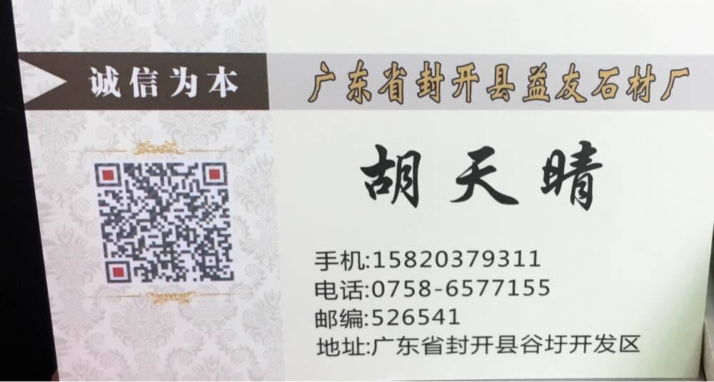 廣東省肇慶市益友石材廠 聯(lián)系人:胡天晴    158****9311 查看 手機(jī)號(hào)碼:無(wú) 主營(yíng)范圍: 花崗巖加工、荒料、大板批發(fā)、石材交易市場(chǎng)、 企業(yè)地址:廣東肇慶封開縣S266兩廣石材交易市場(chǎng)