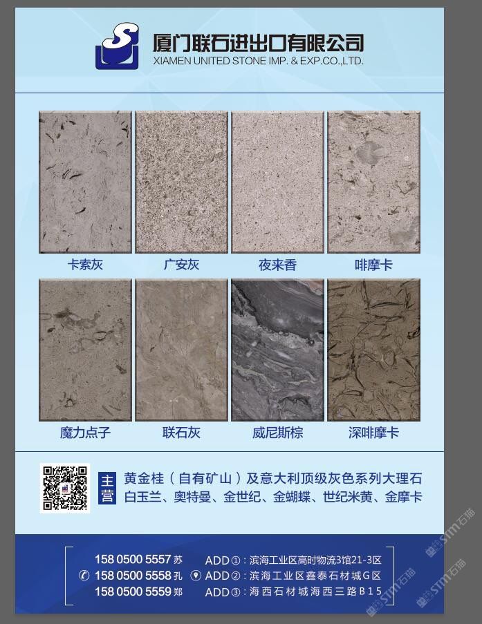 廈門聯(lián)石進(jìn)出口有限公司 聯(lián)系人:鄭俊彬    158****5559 查看 手機(jī)號碼:無 主營范圍: 礦山、荒料、大板批發(fā)、石材外貿(mào)、 企業(yè)地址:福建泉州水頭鎮(zhèn)濱海工業(yè)區(qū)高時3館8倉3區(qū)
