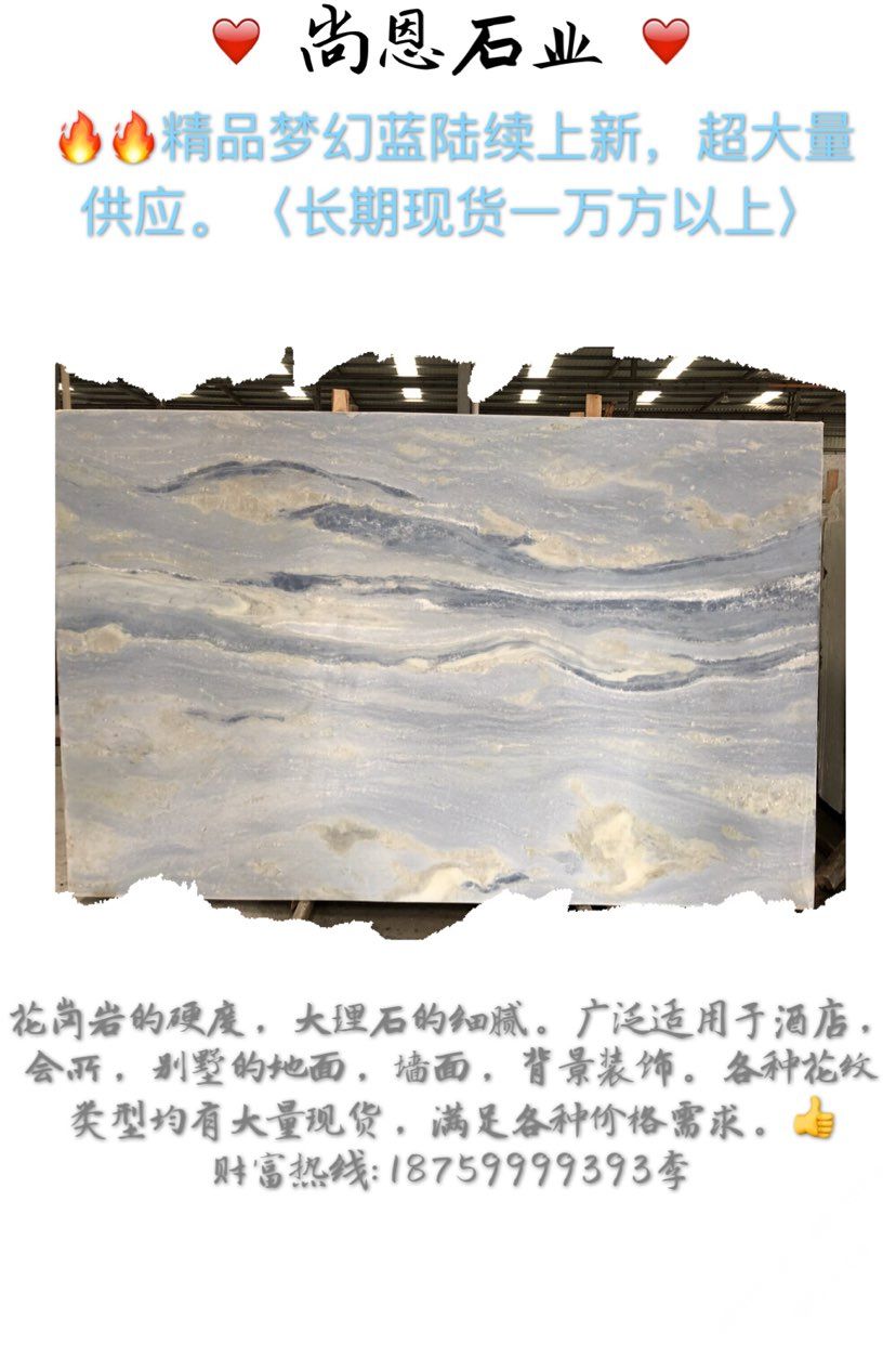 發(fā)布信息: ?? 藍(lán)色blue?永不凋零的奢華! ?巴西輕奢石【夢(mèng)幻藍(lán)】【藍(lán)水晶】【藍(lán)天白云】 ??礦山直銷批發(fā)產(chǎn)品,價(jià)格,奢享從未如此簡(jiǎn)單,量大更優(yōu)惠。 ??藍(lán)色一直是高端別墅,酒店,會(huì)所裝飾色調(diào)。各種紋路,各種底色應(yīng)有盡有,任您挑選。期待與您的合作[耶] ??:18759999393李 地址:鵬翔石材城主通道F9