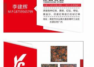 泉州泳昌石材有限公司主營產品:英國棕,紅棕,墨綠麻,銀珠3,藍珍珠,啡鉆,紅鉆,幻彩紅,幻彩紅5,幻彩紅6,紅珍珠,黑金沙(中花),印度紅(大花)企業(yè)地址:福建南安水頭下邦工業(yè)區(qū)